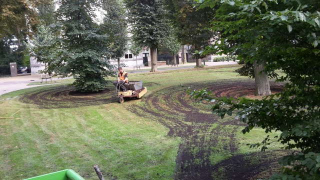 Het mulchen van de bomen in het gazon is zo vormgegeven dat het gazon zoveel mogelijk intact blijft. Alleen in de directe omgeving van de stam is een laag van tien centimeter bladmulch aangebracht. Het aanbrengen van bladmulch om de stam heeft tevens als functie om grassen en kruiden te onderdrukken, waardoor niet meer op korte afstand van de stam gemaaid hoeft te worden. Schade aan de stam door maaiers wordt zo voorkomen. Onder de rest van de kroonprojectie is gazoncompost aangebracht. Deze compost is daarna tussen het gras gewerkt met een sleepnet, zoals gebruikt wordt op tennisbanen.