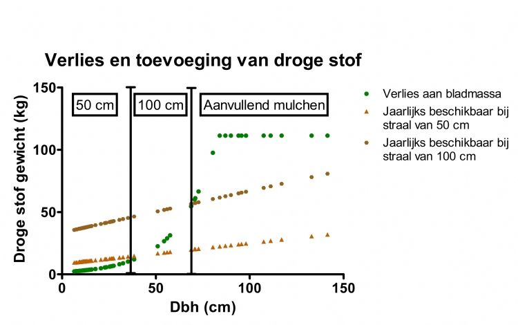Vervolgens is bepaald hoeveel mulch nodig is voor de boom. De behoefte is gelijkgesteld aan de hoeveelheid organisch materiaal als het blad geruimd wordt. Aan de hand van de gemiddelde vertering van bladmulch is berekend hoeveel organisch materiaal beschikbaar komt aan de grond. Daarbij is net als in de proef gekozen voor een zone om de stamvoet waar bladmulch wordt aangebracht. De breedte van de zone is 50 cm of 100 cm, met een laagdikte van 10 cm. In figuur 1 is te zien dat de hoeveelheid organische stof bij een mulchlaag met een straal van 50 cm voldoende is om het bladruimen te compenseren voor bomen tot een diameter van 37 cm. Bij bomen met een diameter tot 70 cm is een mulchlaag met een straal van 100 cm voldoende. Bomen met een grotere diameter hebben een aanvulling nodig, eventueel door de mulchlaag te vergroten, of, zoals in 's-Hertogenbosch, met gazoncompost.