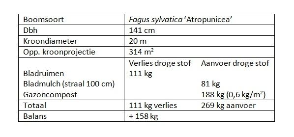 In 's-Hertogenbosch is in de proef 2,25 kg aan gazoncompost per vierkante meter aangebracht. Aan droge stof is dat 0,9 kg/m2. Het gras neemt ongeveer een derde van voedingstoffen op, wat betekent dat effectief 0,6 kg/m2 voor de bomen beschikbaar is. In tabel 1 is een voorbeeldberekening gemaakt voor de hoeveelheid droge stof die verloren gaat door bladruimen en de hoeveelheid die aangevoerd wordt door bladmulch en gazoncompost.