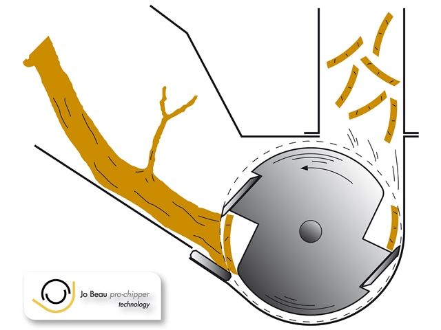 In 1998 kwam de eerste typisch gele mobiele houtversnipperaar W300 op de markt. Jo Beau was geboren. De trommeltechnologie van Jo Beau was revolutionair, vertelt Christophe. ‘Het ging om een hardstalen trommel met twee messen en een tegenmes, met een uitgekiend design. Door de stand van de invoertrechter, in combinatie met de messen die waren gemonteerd op een messentrommel, werd het mogelijk om takken en ander groenafval met hoge snelheid in te voeren, te versnipperen en uit het toestel weg te werken. Daarbij maakte het hakselen dwars op de vezelrichting het verschil. Het resultaat is houtsnippers die er mooi uitzien en voor verschillende doeleinden kunnen worden gebruikt.’
