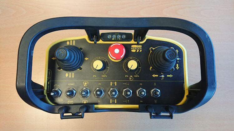 Christo van Doorn van Wim van Breda: 'Met dit formaat machine wil je radiografisch werken; dat is veilig. Door de radiografische besturing staat Boonstoppel op veilige werkafstand, maar heeft hij een goed overzicht. Ook de lichamelijke belasting is minimaal.' Een van de voordelen van de afstandsbediening is het fijn afstellen van de agressiviteit van het zwenken, zodat je de machine bijvoorbeeld langs een muur rustig kunt laten draaien. Andere voordelen zijn het handmatig instellen van het motortoerental tijdens het frezen en rijden en het bedienen van het dozerblad. Door het dozerblad naar beneden te duwen, waardoor de achterkant van het rupsonderstel omhoog komt, zet Boonstoppel de stobbenfrees wat rechter en dus stabieler tegen schuine oppervlaktes, zoals taluds. Het freesbereik is daardoor ook groter. Met de dozer kan hij na het frezen ook het gat dichtgooien en de grond egaliseren. Ook kan hij er houtsnippers mee wegschuiven. 'Je kunt er wat mee spelen en uiteindelijk kom je erachter wat de beste instelling is per boomsoort en -grootte. Dan wordt werken weer routine. Bij een zachte watercipres mag hij wat harder draaien dan bij een dikke eik; dan geef ik de machine ruim de tijd om te frezen', zegt Boonstoppel.
