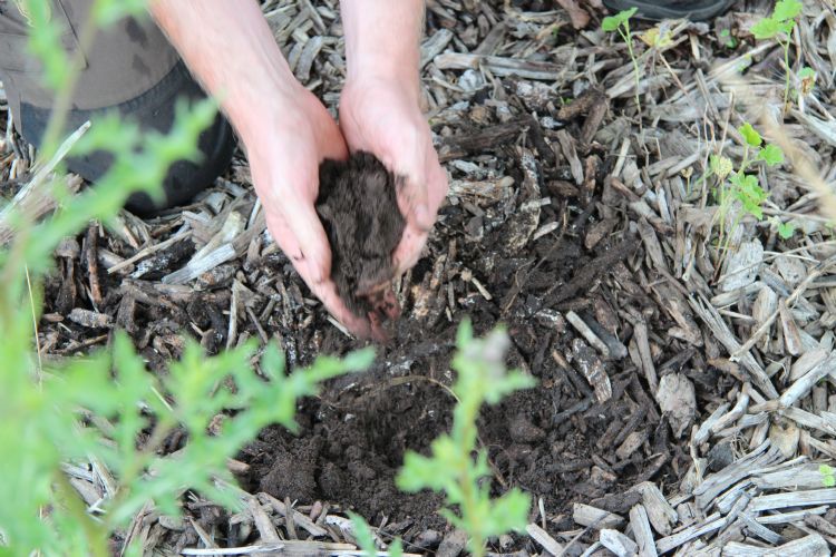 | | Onder de lading mulch blijft de bodem vochtig en is aan regenwormen geen gebrek |