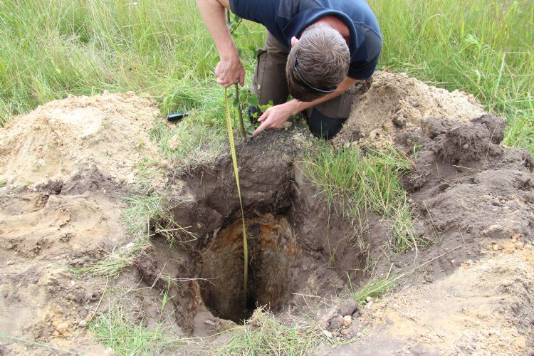 Als Oost-Brabander weet hij alles van droge zandgronden. Als je Nederland verdeelt in drie stukken, is het oostelijke deel van Nederland ongetwijfeld het droogst. Vermeulen laat een gegraven plantgat zien in een nabijgelegen bos, naast zijn proefveld. We zien een halve meter zwart zand, waarvan meer dan de helft verstoft en droog is, terwijl het dit jaar natter was dan de afgelopen jaren. Een stukje dieper treffen we geel zand aan. Met een schroevendraaier laat hij zien hoe hard en versteend dit is. 'Een boomwortel kan hier nauwelijks doorheen groeien', vertelt hij. De drie droge zomers van de afgelopen jaren hebben behoorlijk wat schade aangericht aan de bomen in zijn omgeving. De bovenste bodemlaag droogde bijna volledig uit, waardoor essentiële voedingsstoffen ontoereikend zijn. Het gele zand weerhoudt de wortels om verder te kunnen zoeken, met droogtestress tot gevolg. 'Daar staat een beuk die er niet goed uitziet, daar een eik die het zwaar heeft en hier een linde die ook een verminderde groei laat zien.'