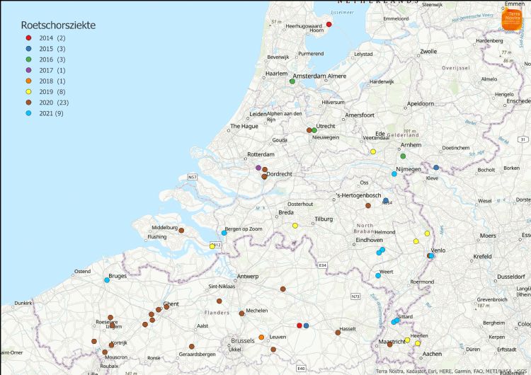 Actuele verspreiding roetschorsziekte in Nederland en België