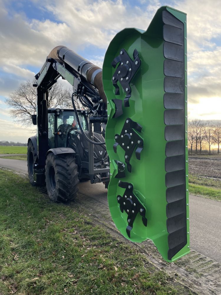 Mosterman vertelt: 'Inmiddels hebben we twee takkenslagmaaiers geleverd: één aan Provaas in Schimmert en een aan de eerder genoemde Veenstra in Nijensleek. Beide machines hebben drie rotors en dat brengt de werkbreedte op ongeveer 2,2 meter. Bij Veenstra is de takkenslagmaaier bevestigd aan onze zogenoemde 'overrijdchassisaanbouw' (Orca). Dit gaat om een hydraulische giekaanbouw van Hemos met een snelwisselsysteem. De driedelige giek heeft een bereik tot 8 meter en is geschikt om er werktuigen aan te monteren zoals maaiers, slootreinigers en frezen. Deze giekaanbouw kan binnen vijf tot tien minuten aan vrijwel elk type tractor worden bevestigd, door over het chassis heen te rijden en het snelwisselsysteem aan te koppelen. Alle hydrauliekslangen zijn weggewerkt in het frame, zodat de bestuurder goed zicht houdt. Met deze giek kun je zowel over links als over rechts werken. Voor degenen die vaak over links werken, is er zelfs een motorkapbeveiliging beschikbaar. Tijdens transport klapt de giek naar achteren; daarmee blijft hij onder de maximale transporthoogte.'
