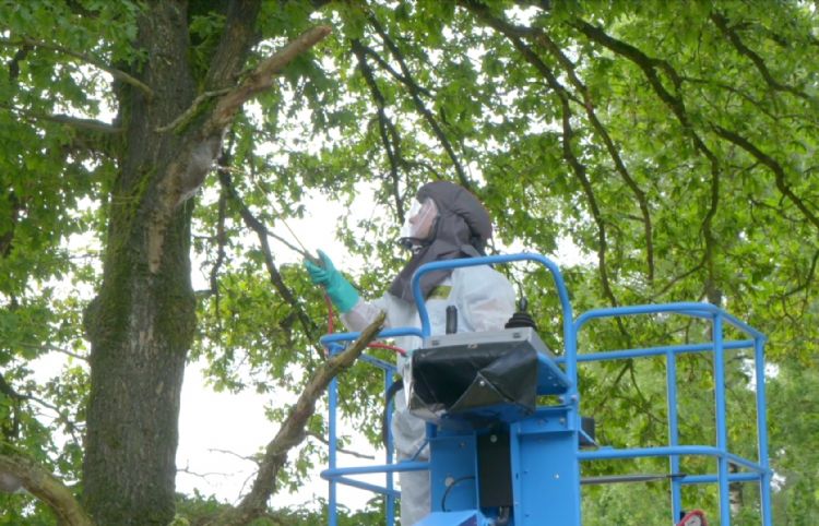 De Groot: 'Bij een grote hoeveelheid eiken met nesten voeren wij de werkzaamheden met Rufix met een hoogwerker uit. Dat werkt heel efficiënt vanwege de snelheid; we kunnen zo veel nesten per uur behandelen. Het scheelt in de kosten dat we geen stofzuiger en aggregaat nodig hebben en geen afval hoeven op te vangen en af te voeren. We hebben alleen een vrij simpele spuit-unit nodig.' De Groot denkt dat het werken met Rufix voor de persoon in de hoogwerker prettiger is dan het wegzuigen van nesten, omdat het minder zwaar is.