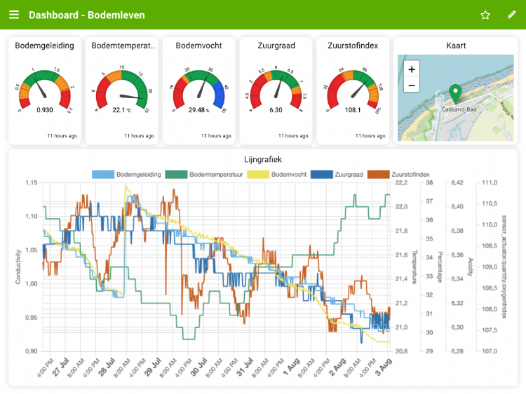 Sinds TreeMania een Interreg-subsidie ontving voor de verdere ontwikkeling van de sensoren, heeft er een belangrijke verschuiving plaatsgevonden. Steeds vaker wordt het bedrijf eerder bij projecten betrokken. Dat geeft TreeMania de mogelijkheid om tijdens het ontwerp en/of de aanleg kennis in te brengen over groeiplaatsen en de aanplant van bomen. Steegh: 'Hiervoor kunnen we een advies geven dat is aangevuld met laboratoriumanalyses. Zo kunnen we zoveel mogelijk van de lokale bodem laten liggen en deze opwaarderen met natuurlijke bodemverbeteraars, zoals steenmelen, klei en verschillende soorten compost, om te komen tot een optimale groeiplaats.' Arnold vult aan: 'Met een goede boom, die op de juiste manier is aangeplant en die een goede groeiplaats heeft, kan het haast niet meer fout gaan, mits er goede nazorg is. Een boom die op de kwekerij is uitgegraven, moet eerst herstellen en zich vestigen op de nieuwe locatie. De eerste jaren na aanplant is de boom erg kwetsbaar; er is veel energie nodig om nieuwe wortels aan te maken én om de samenwerking met het bodemleven op gang te brengen. In die periode is het van levensbelang om op de juiste manier en op het juiste moment water te geven. Op basis van de informatie die wij uit de sensoren halen, weten we dat ook water geven een vak is. Klakkeloos om de zoveel tijd water geven, werkt niet. Te weinig vocht remt de groei, maar te veel vocht ook; dan kan er een zuurstoftekort in de bodem ontstaan. Bij te weinig vocht vallen allerlei fysiologische processen in de boom stil. Het bodemleven heeft nog eerder last van vochttekort dan de boom zelf. Het sterft af of kapselt zich in. Herstel van het bodemleven komt pas weer op gang wanneer het suikers van de boom ontvangt. Dat is een bewuste investering van de boom in het bodemleven. De boom profiteert hier zelf ook weer van. Het bodemleven voorziet de boom namelijk van water en voedingsstoffen, waar de eigen wortels niet bij kunnen. Maar de boom kan alleen suikers leveren als de eigen fotosynthese goed op gang blijft. Op ons dashboard werken we met duidelijke kleuren, om onze klanten zo intuïtief mogelijk te laten zien wat goed en minder goed is.'