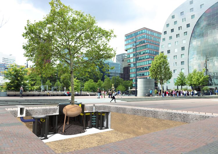 TreeBuilders gebruikte op het Beursplein waterretentiekratten voor waterbuffering onder de groeiplaats. Faas: 'Vanwege de beperkte ruimte hebben we hier kratten van 52 millimeter hoog gebruikt onder een groeiplaats met een diepte van rond de 40 centimeter. Boomwortels hebben nauwelijks diepte om in te wortelen, maar wel veel oppervlak in de breedte. De kratten hebben aan de onderkant een waterdichte folie en aan de bovenkant een absorptiemat die zorgt voor het aanzuigen van water naar het substraat erboven. Een laagje geotextiel bovenop zorgt ervoor dat water en lucht erdoorheen kunnen, maar dat zand en vervuiling de waterkratten niet kan verstoppen. Water kan met behulp van een pomp vanuit een bassin aangevoerd worden naar de kratten.'