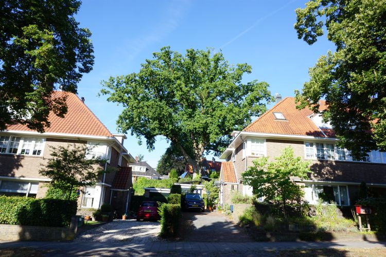 Geplant in 1820 staat een mooie gezonde monumentale eik op twee percelen van particuliere eigenaren. Een blikvanger voor de gehele wijk. 6,12 meter in stamomtrek met nog steeds een massieve stam en een kroon die vele tuinen beschutting biedt.