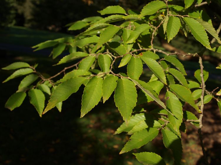 Het fijne blad van Zelkova serrrata ontluikt frisgroen. Vaak zijn delen van de kroon eerder in blad dan andere delen van dezelfde boom. Het sierlijke blad kleurt in de zomer groen en in de herfst fraai geel en oranje. Anders dan voorgaande soorten, die hooguit wat geel worden. De bladeren zijn zo goed als kaal, tot 9 cm lang en getand. De takken zijn vaak sterk overhangend: jonge bomen kunnen scheuten tot 1,5 meter per jaar maken. Zelkova serrata wordt door zaaien vermeerderd. Zaailingen verschillen sterk in groeivorm en herfstkleur. Daarom zijn er bijna veertig cv's op de markt. Ik noem enkele die in Nederland allemaal verkrijgbaar zijn.
