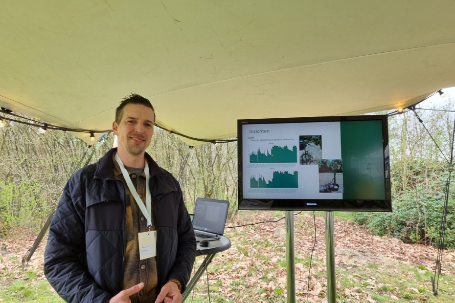 De deelnemers delen ervaringen over groeiplaatsbeheer met elkaar en de voordelen van de sensoren zijn duidelijk, maar wat kosten ze? Koop je er ook een boom voor? Exacte prijzen krijgen we niet, maar Van Eldik vertelt dat een sensor gemiddeld twee jaar op een plek blijft. Dan heb je in principe genoeg data verzameld. Daarna kun je de sensoren op een andere groeiplaats inzetten. Veel bomen halen de twee jaar niet eens. Aan jou de afweging van wat het je kost en wat het je oplevert.