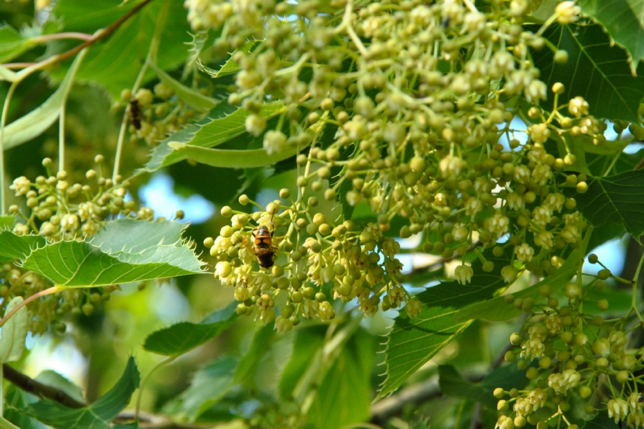 | | Tilia henryana bloeit nog in augustus-september. 'Dit is een heel bijzondere boom en is mijn persoonlijke favoriet onder de lindes. Als je in augustus door zo'n rij loopt in de kwekerij, door de geur heen en met zicht op vele bijen en hommels, weet je niet wat je meemaakt' |