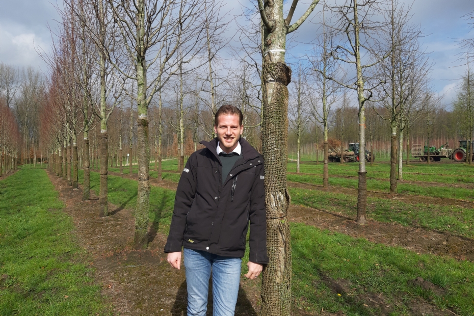 | | Rob Linkels tussen rijen Tilia platyphyllos en tomentosa die zijn ingepakt met kokosmatten die ze aan de westkant tegen de avondzon beschermt |