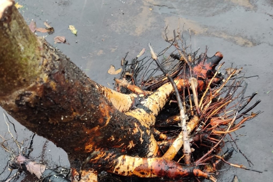 We vragen het na bij Van Eldik en Van der Wal. Eerst licht Van Eldik de start van het diagnosetraject nog even toe, omdat daar een belangrijke boodschap uit volgt. Samen met zijn collega Henk Kwakkel hebben ze eerst het gebruikelijke visuele onderzoek gedaan om te checken op symptomen van onverenigbaarheid. Daarbij hebben ze ook de stamvoet vrijgegraven om de wortelaanzetten te kunnen beoordelen. Dit gaf onvoldoende uitsluitsel. Daarom hebben ze met boombeheerder Van der Wal besloten om bij een aantal bomen een extra praktijkproef uit te voeren, bestaande uit meerdere stappen. De eerste stap: een standaard trekproef. Vervolgens zijn de bomen die de meeste symptomen vertoonden, omgeduwd/getrokken. Tot slot zijn een aantal onderstammen verticaal doormidden gezaagd om de ent en onderstam van binnenuit te kunnen beoordelen.