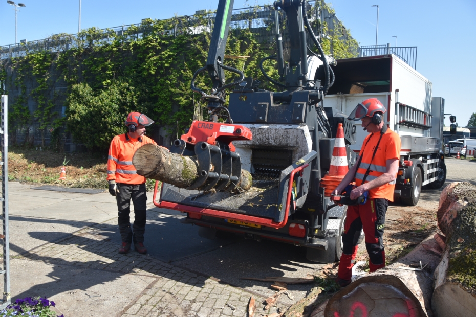 Het team rijdt de circa 6500 kilo wegende luchtgeremde aanhanger met een tandem-as naar een houtopslag. Daar vouwen ze met de radiografische afstandsbediening (GCS1.1) de giek uit en laten ze zien hoe de kraan 270 graden kan draaien. Een teamlid laat zien hoe hij het hydraulisch opklapbare laadplateau ook vanaf de machine zelf in werking kan zetten. Uiteraard is dit laadplateau beveiligd met een noodstopknop en een veiligheidsbeugel. Het team vertelt over de werking van de bovenrol: 'Die heeft een inwendige aandrijving door een Poclain-wielmotor. Hierdoor zijn er geen sleuven aan de buitenzijde waardoor materiaal naar buiten kan spatten. Die invoerrol hoeven we ook niet te smeren, omdat de lagering in de hydromotor in een vol oliebad loopt. De combi-invoertafel is geschikt voor zowel hand- als kraaninvoer, de hydraulisch draaiende uitblaaspijp hydraulisch en de eveneens hydraulische op- en neer verstelling van de strooiklep.' Dan kan het versnipperfeest beginnen. De Crab-grijper legt een dikke populierenstam op het invoerplateau en de messen op de versnipperdrum zetten er gretig hun tanden in. Het team heeft er zichtbaar plezier in. Een van hen roemt de prestaties van de machine: 'We vinden het mooi om ermee te werken. Hij bevalt heel goed. Als bomenteam zijn de meeste leden ETW'ers. Over afwisseling in ons werk valt absoluut niet te klagen. Wij genieten ervan! Het verkrijgen van toestemming is soms een hele puzzel. Zo moeten we rekening houden met de gemeentelijke verordeningen, maar ook met die van de Flora- en Faunawetgeving. Onze werkzaamheden zijn seizoenafhankelijk en zeer divers. Aan platanen werk je bij voorkeur niet in de zomer en zo groeien er in Amsterdam ook boomsoorten die je vanwege het bloeden niet in het voorjaar moet omzagen.' Waar de mannen van dit team het meeste van genieten, maken ze mij ook duidelijk: 'Lekker aan de slag gaan als het een keer flink gestormd heeft. Ook bijvoorbeeld om schade te voorkomen aan woonboten waar bomen op dreigen te vallen. Dan geldt "nood breekt wet" voor ons om de stormschade op te ruimen!'