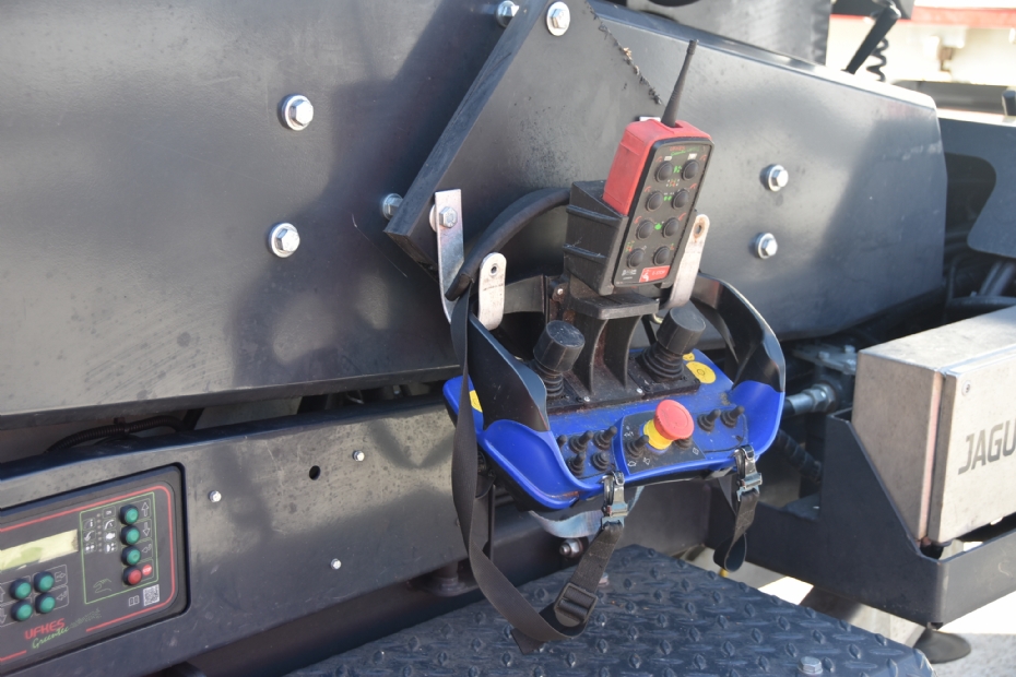 Mario, Mike en Ruben staan te popelen om hun Greentec Jaguar te laten zien. Op de gemeentewerf aan de Rozenburglaan wijzen ze op twee zaken die ze zelf aanbrachten: de hydraulisch aangedreven lier met staalkabel, waarmee ze stammen naar de werkplek kunnen slepen. De Crab-grijper aan het uiteinde van de telescopische houtkraan TG64T kan zo'n stam dan oppakken en op het invoerplateau leggen. Ook hebben ze van hout een tweede, iets lagere kettingzaaghouder aan de machine gemonteerd, zodat een wat minder lange collega niet naar de zaag hoeft te reiken. Alle chipperfuncties laten zich zowel handmatig op de machine als radiografisch bedienen. Als je de radiografische bedieningsconsole tijdelijk even kwijt wil, heeft de machine een handige beugel waarin je hem een veilige plek kunt geven. Elk team dat met de machine werkt, heeft zijn eigen werkwijze. Een van de teams heeft zakken aan de drie hydraulische afstempelpoten bevestigd, waarin ze tijdelijk die console kwijt kunnen.