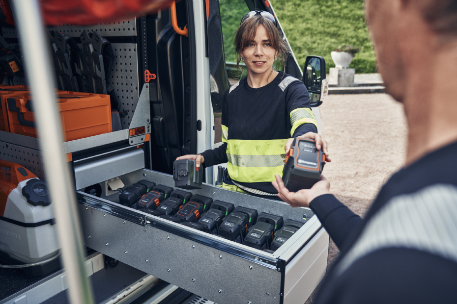 Tja, waarom zo'n tussenkopje? Aandacht voor accu's staat namelijk hoog op de prioriteitenlijst van het Pro-team. Van Veldhuizen: 'We zijn de ogen en oren van Husqvarna. Wij komen veel bij hoveniers en groenvoorzieners en geven via workshops informatie over hoe deze accumachines van Husqvarna te gebruiken. Ook adviseren we op welke manier een bedrijf de werkzaamheden goed kan elektrificeren. Het kan namelijk een hele puzzel zijn welke machines, accu's en laders je precies nodig hebt. Vaak leiden er meerdere wegen naar Rome. En samen met het bedrijf proberen we daaruit te komen. Vergeet daarbij niet de laadoplossingen gedurende de dag, zoals ook het veilig opladen tijdens transport. Maar denk bovendien aan laden en opslaan van Lithium-ion-accu's in (brand)veilige oplaadkasten, zoals daar sinds december 2023 normen voor gelden voor bedrijven. Opladen in de werkbus in een aparte klimaatbestendige kast is bij Husqvarna ook een totaal nieuwe ontwikkeling. Die kast kan zowel koelen als verwarmen. Daardoor kun je onder koude omstandigheden toch je maximale accucapaciteit benutten dankzij voorverwarmde accu's. Anderzijds is de afvoer van geproduceerde warmte tijdens het opladen belangrijk om de levensduur van je accu's te verlengen. Klimaatbeheersing hier betekent een verbetering van de accu-efficiëntie.'