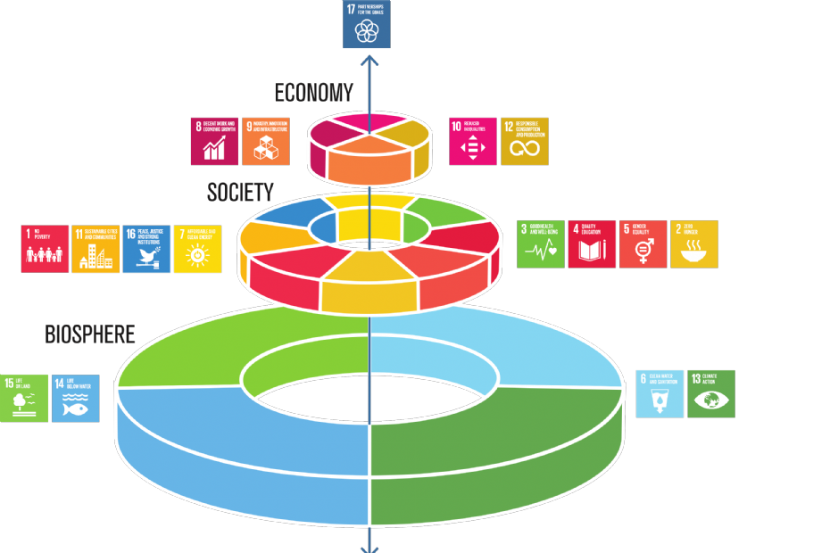 | | De 'wedding cake' van de Sustainable Development Goals (SDG). Illustratie vrij te gebruiken onder licentie CC BY-ND 3.0 |