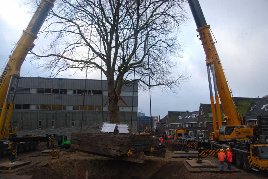De uitvoering van het verplantingsproject kwam in handen van de Nationale Bomenbank. Dirk Doornenbal, algemeen directeur van het bedrijf, licht toe: 'Deze plataan woog 180 ton en had een kluit van 7 bij 7 meter. De locatie, vlak naast het stadhuis, maakte de operatie extra complex.' Een half jaar eerder was in dezelfde stad een ernstig kraanincident geweest, dat wereldwijd het nieuws had gehaald. Dit zette veiligheid nog scherper op de agenda. 'We hebben speciale maatregelen genomen', vervolgt Doornenbal. 'Het stadhuis werd tijdelijk ontruimd, bewoners van enkele omliggende huizen werden geëvacueerd en het terrein werd afgezet. De raadsvergadering werd tijdelijk stilgelegd en alle leden kwamen naar buiten om naar de verplanting te kijken.'