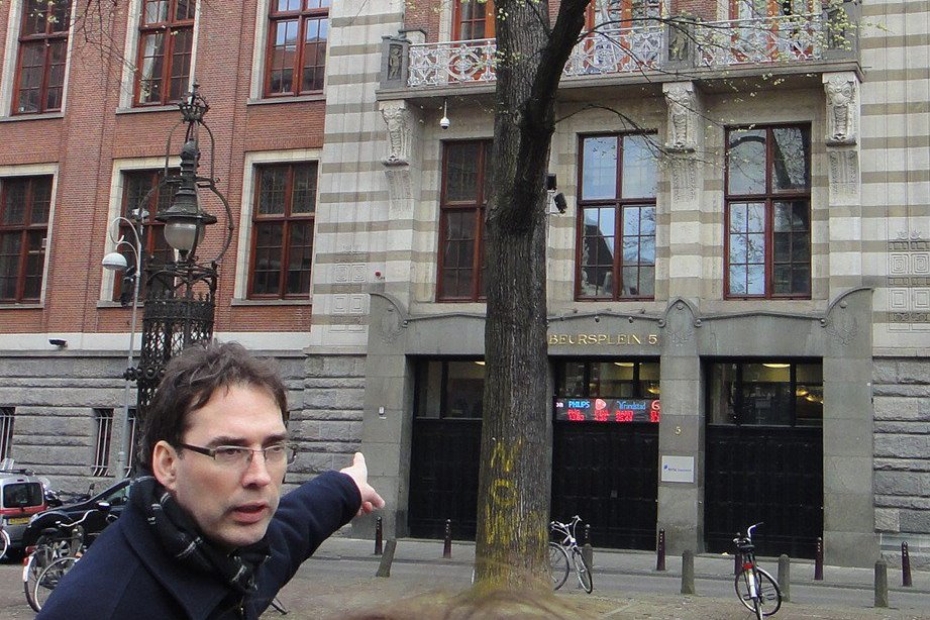 | | Simon Lelieveldt tijdens een rondleiding bij de historische iep van Beursplein 5 |