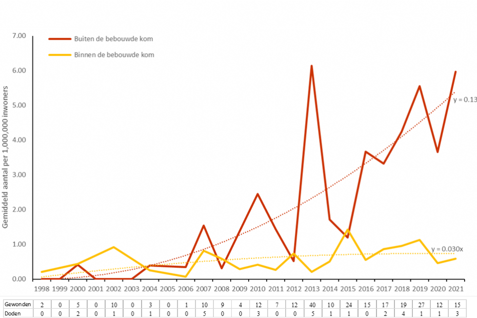 Hoewel 75 procent van de incidenten binnen de bebouwde kom plaatsvond, was de kans op letsel -na correctie op basis van de bevolkingsdichtheid - buiten de bebouwde kom 2,5 tot 4 keer zo groot. Ook was de toename van het aantal gevallen van letsel buiten de bebouwde kom groter: een groei van 13,2 procent per jaar tegenover 3 procent binnen de bebouwde kom, en dat terwijl de oppervlakte van het landelijk gebied juist is afgenomen, net als het aantal bomen. Aan de andere kant is de gebruiksintensiteit van het landelijk gebied toegenomen, bijvoorbeeld door toenemende recreatie.