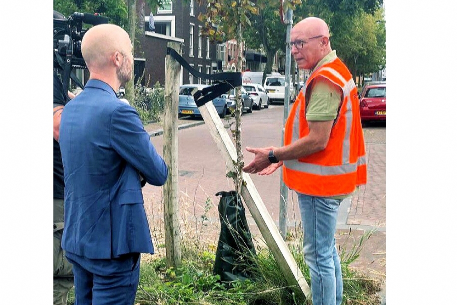 Maar vooral jonge en recent verplante bomen hebben nu extra aandacht nodig, zoals hij in het NOS-journaal laat zien bij een jonge haagbeuk die door vroege droogte al is afgestorven. 'Zij beschikken nog niet over een volledig ontwikkeld wortelgestel. Wij voorzien daarom een groot aantal bomen momenteel van water,' aldus Loch.