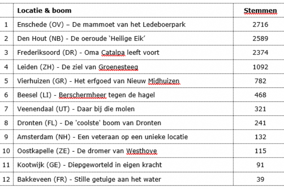 De mammoetboom van het Ledeboerpark in Enschede is uitgeroepen tot de Boom van het Jaar 2025. Met 2716 stemmen gaf deze Sequoiadendron giganteum de Heilige Eik in het Noord-Brabantse Den Hout het nakijken. Het was een spannende race, want de kanshebbers lagen qua stemmen dichtbij elkaar. In totaal werden er 10.960 stemmen uitgebracht.