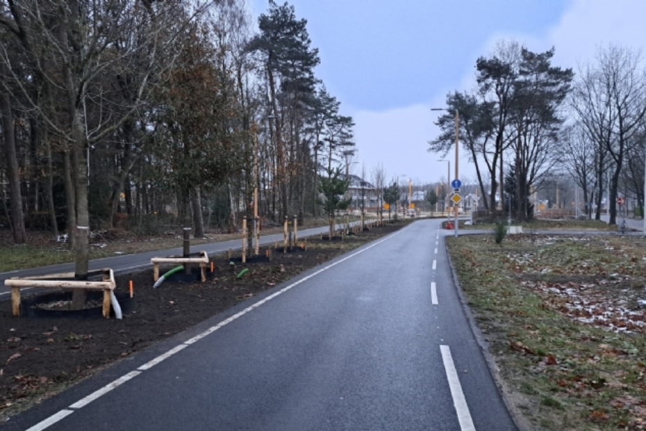 In het ontwerp is veel ruimte gelaten voor natuur, landschap en biodiversiteit. Denk aan brede bermen, natuurvriendelijke oevers en een groene invulling die past bij het Veluwse karakter van de omgeving. De boomsoortenvariatie is divers en bestaat uit Chinese vernisboom, Perzisch ijzerhout, rode esdoorn, maar ook beuken en eiken. Dit geeft zeker in de herfst een prachtig kleurenpallet. Quercus Boomexperts is vanaf het begin betrokken bij de groeninrichting van het project. Ze verzorgden onder andere de kap, de voorbereiding van de groeiplaatsen en de aanplant van de bomen. Ook de nazorg, die dit voorjaar begint, ligt bij het bedrijf. Dit is zeker gezien de huidige klimatologische omstandigheden een belangrijk onderdeel van de kwaliteitsbewaking bij nieuwe aanplant.