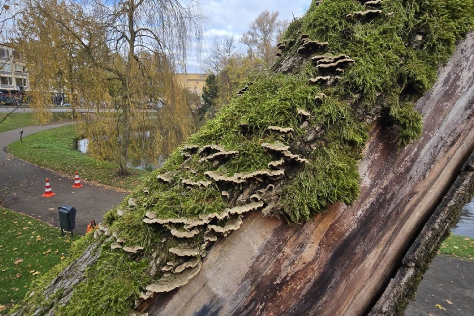 Samen leren: een toolboxmeetingOmdat dit soort bomen niet in standaard protocollen passen, organiseerde Bouwmeester samen met de gemeente een toolboxmeeting op locatie. Geen theoretische sessie in een zaaltje, maar ter plaatse leren: samen kijken, overleggen, meningen delen en varianten bespreken en testen.In de praktijk betekende dat onder meer dat een vanglijn in de boom werd bevestigd en dat medewerkers - twee personen tegelijk - aan verschillende takken gingen hangen. Sommige takken bleven zitten, andere braken direct af. Het was geen wetenschappelijk verfijnde methode, maar gaf het team wél een goed beeld van de resterende draagkracht en het breukgedrag van de boom. Het leverde waardevolle inzichten op voor deze casus en vergelijkbare situaties. ToolboxmeetingDe toolboxmeeting maakte bovendien duidelijk hoe belangrijk een gedegen expert judgement is. Elke situatie is anders en vraagt om een beoordeling waarin verschillende aspecten worden meegenomen, zoals:● de houtsoort en groeisnelheid, ● zichtbare kenmerken, zoals vruchtlichamen, verlies van de korst, lengtescheuren, ● het gedrag van takken bij fysieke belasting, ● de standplaats, windbelasting en vermoedelijke conditie van het wortelpakket, ● het risicoprofiel van de omgeving. Enige tijd na de toolboxmeeting bezocht Haverkamp de boom opnieuw. Enthousiast vertelt hij dat er op de recente zaagvlakken alweer nieuwe vruchtlichamen waren doorgebroken. Haverkamp: 'Bomen met aantastingen worden al snel geclassificeerd als risicobomen, maar vanuit ecologisch perspectief zijn het pareltjes. Ik zie schimmels als bomengasten die we moeten koesteren.' Blijvend dilemma: biodiversiteit of zorgplichtUit beide gesprekken blijkt dat er nog veel te leren is:● Wanneer is het nog verantwoord om een een dode (staande) boom te laten staan en wanneer niet mee? ● Hoe verhoudt het streven naar een gezonde fysieke leefomgeving met ruimte voor natuurlijke processen zich tot onze plicht om die leefomgeving veilig te houden? ● Hoe vinden we binnen de wettelijke kaders van de Omgevingswet een passende balans tussen verschillende maatschappelijke doelen? ● Wanneer heeft een gemeente zorgvuldig genoeg gehandeld? Dat laatste is niet alleen een boomtechnisch, maar vooral een juridisch, bestuurlijk én maatschappelijk vraagstuk. Want hoeveel risico zijn we als samenleving bereid te accepteren? En als dat de biodiversiteit ten goede komt, zijn we dan bereid iets meer risico te lopen of ons eigen gedrag aan te passen? Niet de boom aanpassen, maar de omgevingZowel Bouwmeester als Haverkamp benadrukt dat je risico's ook kunt verkleinen door de omgeving aan te passen in plaats van de boom. Dat kan bijvoorbeeld door:● bankjes te verplaatsen, ● het maaibeheer aan te passen, ● paden te verleggen, ● waarschuwingsbordjes te plaatsen, ● bewust een afgebroken tak te laten liggen als signaal voor bezoekers, ● groenbeheerders actief te betrekken bij het signaleren van risico's. Door slim met de ruimte om te gaan, kun je dode bomen langer veilig laten staan. Bouwmeester verwoordt het als volgt: 'We moeten meer natuurvolgend gaan beheren en stoppen met het traditionele stofzuigerbeheer. Dood organisch materiaal zorgt voor prachtige kringloopprocessen. Als we op een verantwoorde manier iets meer aan de natuur durven overlaten, staat daar veel ecologische winst tegenover.' Kennis delen als sleutelZoals Bouwmeester aangeeft, is het beoordelen en beheren van dode bomen in drukbezochte stedelijke situaties nog relatief nieuw in ons vakgebied. Gemeenten en boomverzorgers lopen vaak tegen dezelfde vragen en dilemma's aan. Daar ligt volgens hem een grote kans: meer casussen bespreken en kennis en ervaringen uitwisselen tussen gemeenten, adviseurs en uitvoerders.