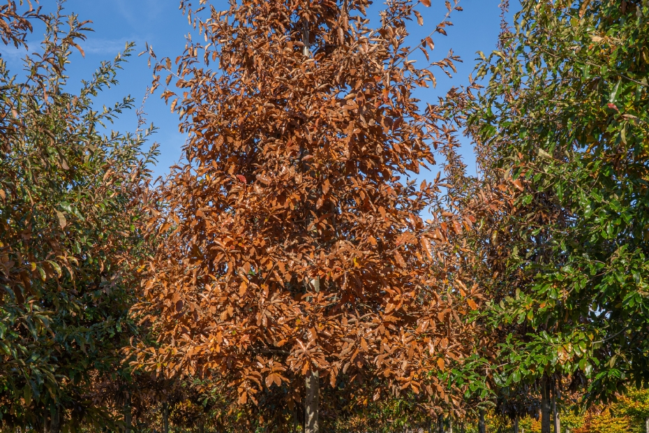 Niet alle toekomstbestendige stadsbomen zijn hybriden. Mouwen: 'Quercus imbricaria, de dakspaaneik uit Noord-Amerika, bewijst zich als soort al decennialang in warme, droge omstandigheden. Met zijn sterke houtstructuur en tolerantie voor luchtvervuiling is hij geschikt voor lanen en parkachtige situaties. Ook Zelkova serrata, verwant aan de iep maar veel minder vatbaar voor iepziekte, past in deze benadering. Door zijn fijne vertakking, sterke hout en hoge tolerantie voor stedelijke stress is hij een waardevolle aanvulling op een divers palet. Want ik herhaal het nog maar eens: zolang je mengt, is er niets aan de hand. Hoe meer diversiteit, hoe minder kans op ziekten en plagen.'