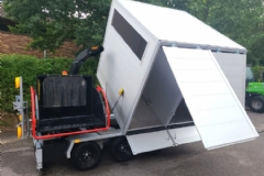 Het project vergde flink wat uitzoekwerk. 'Uiteindelijk hebben we aanhangwagenbouwer Kuiphuis bereid gevonden aan de ontwikkeling mee te werken. Die is mee gaan denken, gaan tekenen en heeft ook goed gekeken naar wat RDW-toelaatbaar is. Met de versnipperaar achterop kun je de bak zijwaarts kiepen.' LMB Van Ginkel voegde daar wensen aan toe qua volume, afwerking en details. 'Dat is aardig gelukt.'