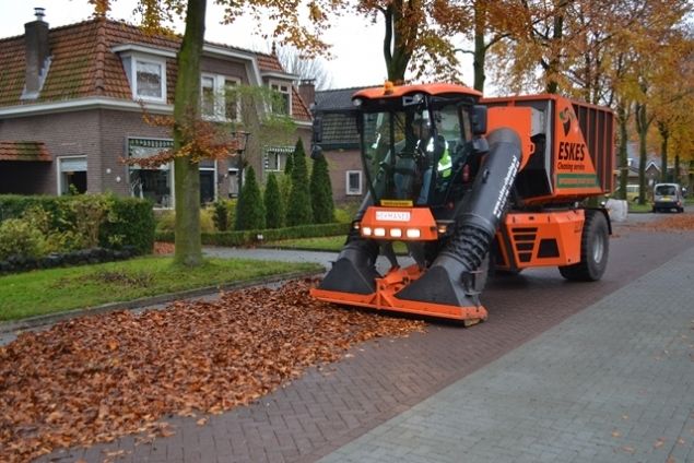 Op de foto hierboven de zelfrijdende Widontec die met twee zuigmonden blad opzuigt en in een verzamelkooi deponeert. Deze machine kan ook met het blad op grasvelden uit de voeten.