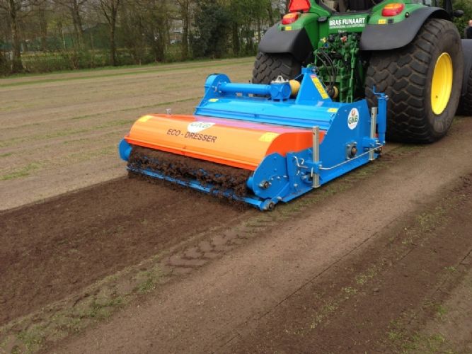 Met de Vstrong met een werkbreedte 240 kan Bras Fijnaart snel grote oppervlakten verticuteren en frezen. De ecodresser, met eenzelfde afmeting als de verticuteermachine, haalt grond uit de toplaag en brengt deze bovenop de toplaag aan, waardoor het niet meer nodig is aparte dressgrond aan te schaffen.