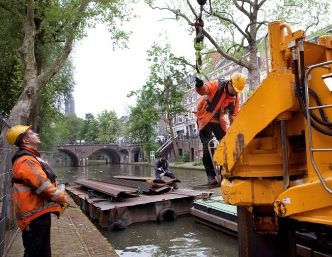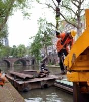 Bouw kraanboot voor reconstructie walmuren Utrecht |