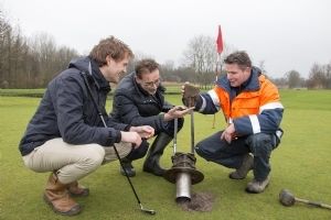 NGF-agronoom Niels Dokkuma, directeur-generaal Chris Kuijpers en Leen van Reeuwijk, hoofdgreenkeeper van Golfclub Zeegersloot, bekijken de wortelgroei op een van de greens die inmiddels volgens de Green Deal-afspraken met 'natuureigen’ middelen is behandeld tegen onkruiden en schimmels.