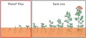Wanneer op het te behandelen oppervlak (open verhardingen) groter onkruid staat (vanaf 4e bladstadium) is een behandeling met alleen Pistol Flex volgens Bayer niet voldoende om het oppervlak geheel vrij te maken van bestaand onkruid. In dit geval is een tankmix met glufosinaat-ammonium (Finale 4ltr/ha of Basta 3ltr/ha) of glyfosaat-bevattend product een prima oplossing (Dosering van glyfosaat kan per toelating verschillen. Glufosinaat ammonium in niet toegelaten voor open verhardingen of in het openbaar groen, dus die mag alleen gebruikt worden door de boomkwekerij. Raadpleeg voor het mengen het betreffende etiket voor de juiste dosering). De verschillende formuleringen laten zich zeer gemakkelijk mengen met Pistol Flex en zorgen voor zeer effectief resultaat op bestaand onkruid en voorkomt voor maanden een nieuwe opkomst. Zichtbare werking is te verwachten na 2 tot 6 weken en is werkzaam tegen een groot aantal grassen en breedbladigen.