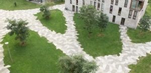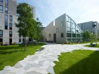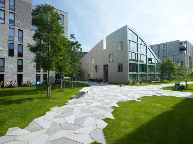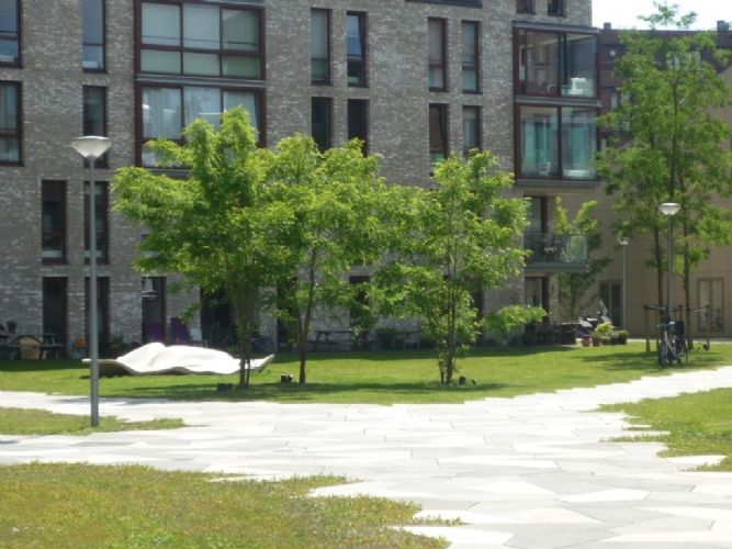 Het ontwerp bestaat uit drie ingrediƫnten: gras, verharding en bomen. De speciaal ontworpen verharding vormt een intensief netwerk van paden. De mazen in het netwerk bestaan uit gras, beplant met gestrooide groepen Robinia pseudoacacia en narcissen. De transparante kronen van de Robinia pseudoacacia gaan goed samen met de architectuur; de narcissen zorgen voor een vrolijke toon in lente. Verschillende initiatieven zoals het introduceren van potplanten langs de gevels verlevendigen de informele parksetting. De vijfhoekige tegels in het park laten het hemelwater passeren om vervolgens het water in de wegfundering te bergen en af te voeren. Dit volgens het Aquaflow-principe. De tegels hebben de Dutch Design Prijs 2007 gewonnen.