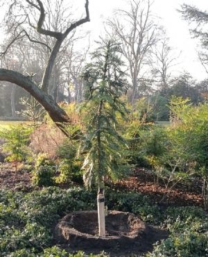 Het exemplaar is wel enigszins verscholen en op een beschutte plek geplant, in een hoekje dat is ingericht als pinetum. Dit mede omdat hij officieel winterhard is tot -5. In Engeland zijn er echter diverse 'jonge' exemplaren bekend die vorst tot -15 hebben overleefd.