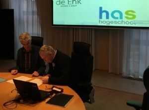 Op de foto: Sjaak Groen (Has Hogeschool Den Bosch) en Gerard van der Werf (de Enk Groen & Golf) ondertekenen de samenwerkingsovereenkomst.
