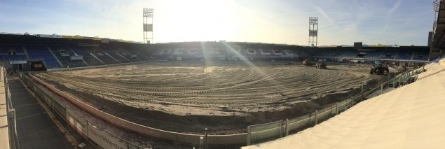 Ophoging hoofdveld Het bijzondere aan dit project is dat het veld wordt opgehoogd: de nieuwe mat komt zo'n veertig centimeter hoger te liggen dan het oude veld, aldus Ceelen. Dat moet zorgen voor een beter zicht op het veld voor het publiek. Voor die ophoging is behoorlijk wat zand nodig; zand dat geleverd wordt door Heicom. In totaal wordt er 3600 kubieke meter zand in het Mac3park-stadion gestort. De vrachtwagens rijden in totaal 180 keer op en neer naar de zandbron.
