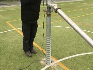 De traditioneel aangebrachte grondpotten worden met een grondboor voorgeboord en vervolgens in de grond geslagen. Met de nieuwe fundatiemethode worden grondpotten die zijn voorzien van schroefdraad zonder verwijdering van de sporttechnische onderbouw machinaal aangebracht. Ook wordt er een aanpassing gedaan aan de centreerring op de paal zodat palen makkelijker kunnen worden verwijderd. In de gemeente Den Haag zijn onlangs naar volle tevredenheid op diverse korfbalvelden traditionele grondpotten vervangen door grondpotten met schroefdraad.