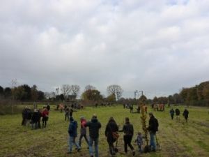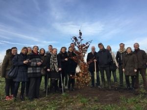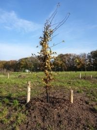 Afbeelding links: bij elke boom is 0,25 m3 compost van Den Ouden Groep toegevoegd. Links van de boom staat een tijdelijke boompaal om de boom mee vast te zetten. Rechts staat een duurzame paal waarop een aluminium boomnummer is bevestigd. Na aanplant krijgt elke boom een stambeschermer en wordt de boomspiegel afgewerkt met een laag mulch. Gebruikersovereenkomst Stichting Levensbomenbosch en gemeente 's-Hertogenbosch stellen in overleg een gebruiksovereenkomst op. De betreffende 1,3 ha dient te worden afgewaardeerd en krijgt de bestemming bos. Gemeente 's-Hertogenbosch neemt deze kosten voor haar rekening. In de overeenkomst is opgenomen dat Stichting Levensbomenbosch gedurende vijf jaar verantwoordelijk is voor de grond en de bomen. Daarna wordt het overgedragen aan de gemeente. Website De gebruiksovereenkomst is dan nog niet getekend, maar de stichting heeft alle vertrouwen in de gemeente en start met het maken van een website: www.levensbomenbosch.nl. Hein van de Kerkhof (Hein(c)) helpt daarbij. Op de website is het ontwerp weergegeven en kunnen mensen zelf de locatie en een boomsoort kiezen. De investering voor de boom is inmiddels vastgesteld op 125 euro. Doordat er minder bomen aangeplant kunnen worden, zijn de kosten per boom toegenomen. Afgestemd op de nieuwe locatie is gekozen voor de volgende vijf boomsoorten: tamme kastanje, bruine beuk, zoete kers, winterlinde en haagbeuk. Publiciteit Even later is de website gereed en staan we te popelen om het levensbomenbos te presenteren. De ondertekening van de gebruiksovereenkomst door voormalig wethouder en voorvechter van het levensbomenbos, Jos van Son, vond plaats op 7 september 2017. De stichting maakt een eigen Facebook- en Twitter-account en hangt posters op prominente plekken in 's-Hertogenbosch en Rosmalen. Ook lokale huis-aan-huisbladen en gemeente 's-Hertogenbosch helpen een handje met de publiciteit. De verkoop gaat vliegend van start en na ruim twee maanden zijn alle 135 bomen verkocht.
