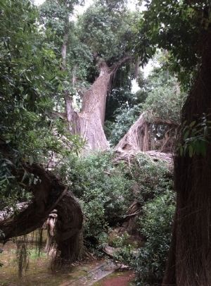 Het gaat hier om een zeer oude 'pohutukawa' (Metrosideros excelsa), van origine afkomstig uit Nieuw-Zeeland. De boom is weliswaar verkrijgbaar in Nederland, maar is niet winterhard en als je hem hier ziet, zal het waarschijnlijk zijn als kuipplant. In Nieuw-Zeeland staat de boom rond de kerstdagen in bloei, waardoor hij de bijnaam New Zealand Christmas tree heeft.