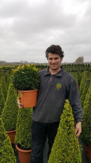 Om te onderzoeken of dit voorkomen kon worden met gecontroleerd vrijkomende meststoffen, werkte het bedrijf van Manders nauw samen met Jo Slijpen van Ekompany. Opzet en toepassing 'Faulkner' groeit iets anders dan Sempervirens. 'Faulkner' wordt iets later groen, waarbij het op kleur houden van de plant gedurende de winterperiode vaak problematisch is. Dit is een gevolg van tekorten in de voeding. 'In de proef hebben we een product toegepast met een looptijd van vier tot vijf maanden, dat gedurende die periode continu voeding afgeeft. De plant krijgt dus iedere dag een beetje voeding zonder pieken, in plaats van in korte tijd heel veel of te weinig, zoals bij conventionele bemesting vaak het geval is', legt Jo Slijpen van Ekompany uit. 'Specifiek gaat het om een NK-meststof (18-0-16+3MgO), waarvan de stikstof en het kalium gedeeltelijk (75-80%) zijn gecoat. De dosering per hectare voor deze meststof was 525 kg.' Bodemleven en uitspoeling Tonton Buxus heeft veel aandacht voor het bodemleven. 'Het is natuurlijk algemeen bekend dat het bodemleven van groot belang is en dat we als telers hierbij onze verantwoordelijkheid moeten nemen', aldus Manders. 'Daarom gebruiken wij als basis organische bemesting. In ons geval is dit een 8-3-3-variant, waarvan 1200 kg per hectare is toegepast in drie werkgangen. Het voordeel van deze meststof is dat op deze manier ook het bodemleven wordt gevoed, wat op termijn zorgt voor een gezonde voedingsbodem. Een nadeel is echter dat deze meststoffen snel uitspoelen, waardoor de plant vaak onvoldoende voeding krijgt. Dit zagen we in ons geval terug in de winterkleur. Daarom dien ik ook bijbemesting toe in de vorm van Ekote-gecontroleerd vrijkomende meststoffen.'