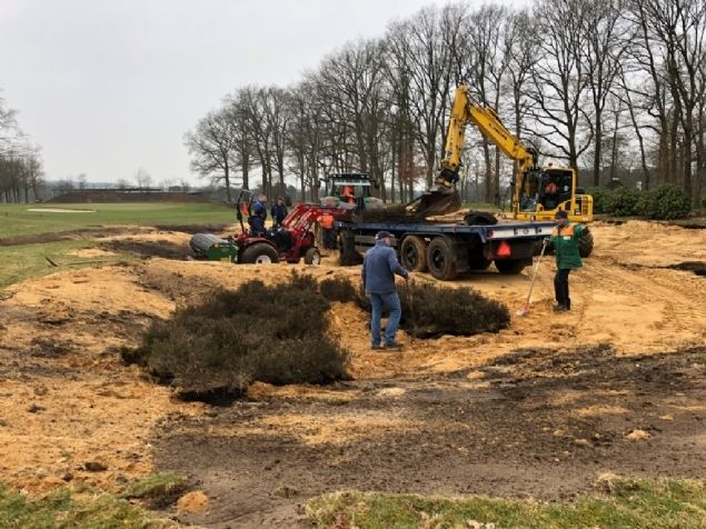 De ontvangende bodem werd door baanaannemer Aha de Man geschikt gemaakt door afgraving van de bodem tot op het zand (we schreven er al eerder over in dit bericht). Met de afgegraven grond werd een wal achter de green van dezelfde hole aangelegd, waarmee het daarachter gelegen driving range-gebouw grotendeels aan het zicht werd onttrokken, mede dankzij de succesvolle terugplaatsing op de wal van de krenten die er oorspronkelijk stonden.