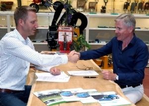 Op de foto: Rob Basten (Lecoba) en Hans Gilbers (Waterkracht) schudden elkaar de hand in de showroom van Lecoba nadat het contract is getekend