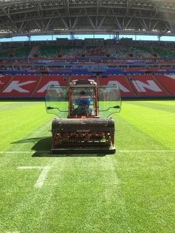 De Redexim-machines worden in alle WK-stadions gebruikt, zo ook in de Kazan Arena. Een dag vóór de kwartfinale tussen België en Brazilië is het hybrideveld in de Kazan Arena belucht met een Verti-Drain 7215 (pennen met een diameter van 8 mm) omdat het veld te hard was. De twee bovenstaande foto's zijn gemaakt op donderdag 5 juli, evenals onderstaande video.