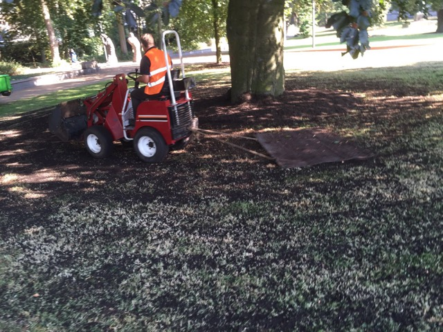 Het slepen over de gazoncompost om de compost fijn te maken en in te werken (bron: L. v.d. Veeken)