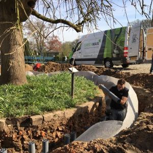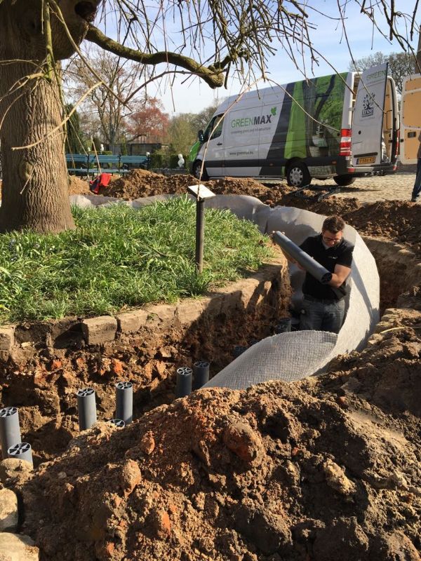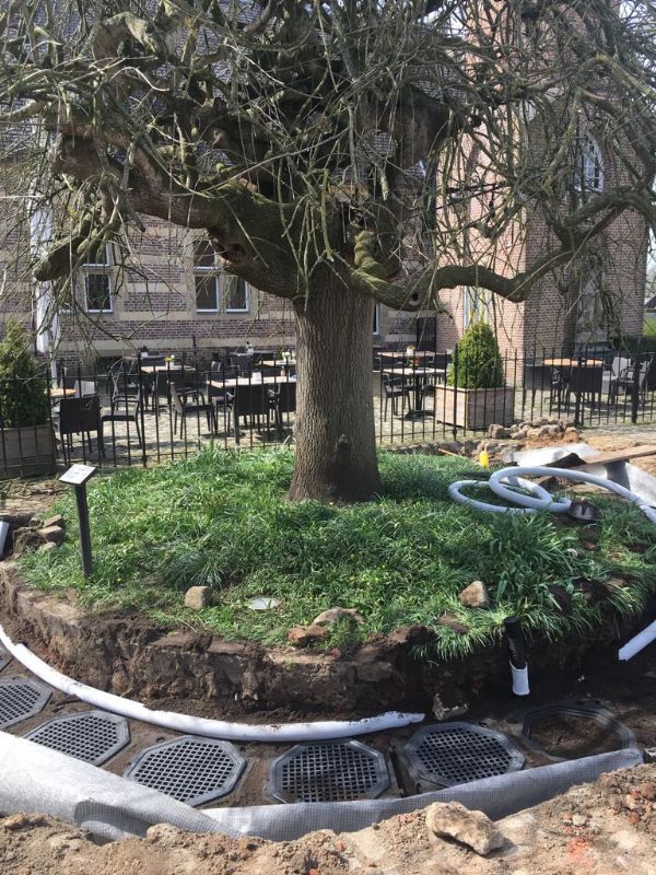 'We hebben de aanleg van een boombunker geadviseerd', zegt Van Oss. 'Treebuilders, ons dochterbedrijf, heeft het Treeparker-wortelbunkersysteem uit voorraad geleverd. Treeparker zorgt voor een onverdichte groeiplaats en boven op de bunkers komt bestrating. De zitbankjes kunnen dan weer onder de boom geplaatst worden. Zo behoudt het plein esthetisch zijn karakter, maar kunnen we de leefomstandigheden van de boom toch verbeteren.'