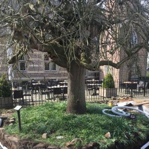 Eric van Oss, eigenaar van Greenmax: 'Ik zei: natuurlijk gaan we dit project sponsoren. Ik ben opgegroeid in de nabijheid van het kasteel en ook ons bedrijf ligt er vlakbij.' Toen Van Oss op locatie kwam kijken, zag hij dat een grotere boomspiegel geen geschikte optie was. Werner Hendriks, boombunkerspecialist bij Greenmax-dochter Treebuilders, legt uit waarom: 'Natuurlijk gaat de voorkeur uit naar een zo groot mogelijke open groeiplaats en boomspiegel. Maar zoals zo vaak moest er ook op deze locatie rekening gehouden worden met meerdere functies van het plein waarop de treures staat. Het kasteelplein wordt namelijk gebruikt voor feesten en bruiloften vanwege de betoverende sfeer. Het vergroten van de boomspiegel zou ten koste gaan van het beperkte verharde oppervlak. Op het plein ligt een terras bij de boom, en er staan bankjes onder. Het zou jammer zijn als het plein aan uiterlijk en functionaliteit moest inleveren en de bankjes niet meer onder de boom zouden kunnen staan', aldus Van Oss, die zelf zijn trouwerij hield op dit kasteel.